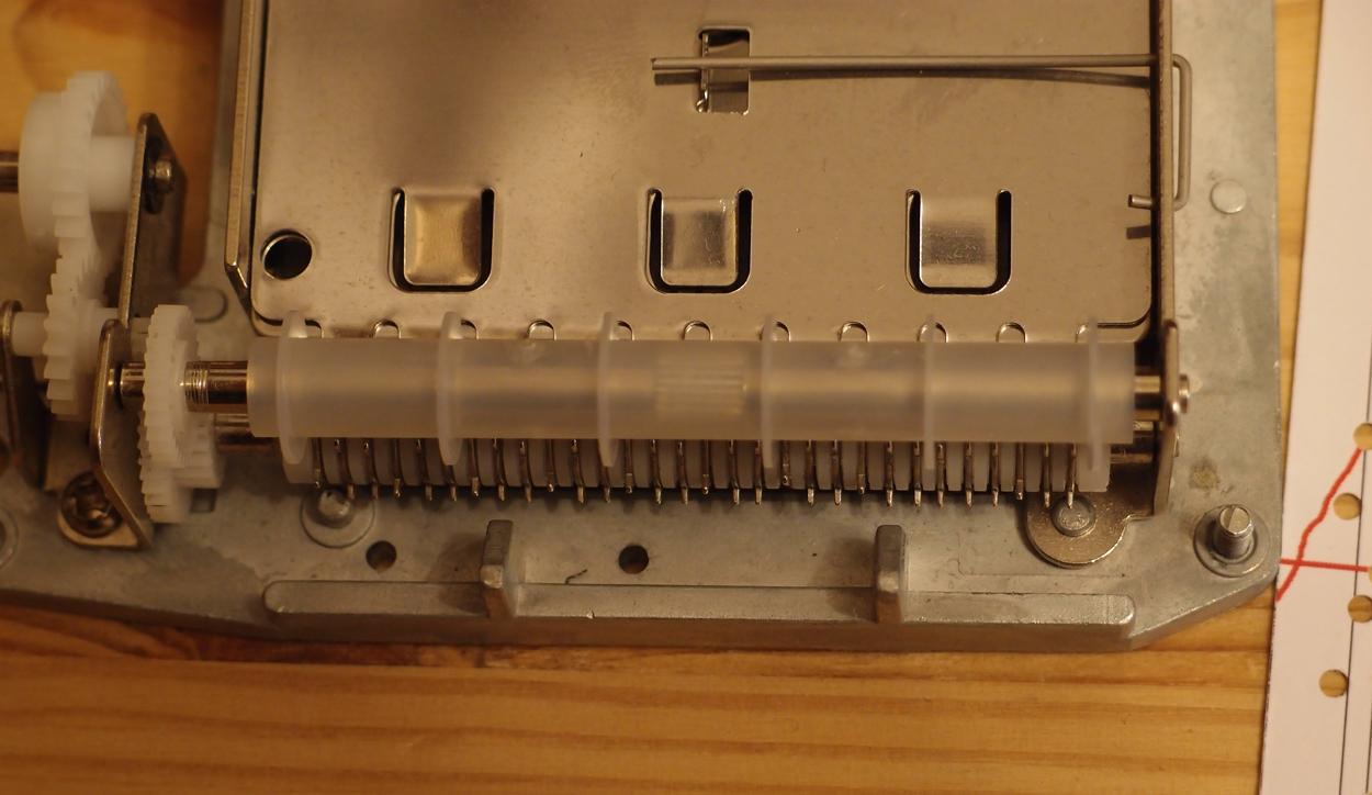 (Beim Einführen der Papierstreifen in die Spieluhr werden zuerst alle Stimmzungen gleichzeitig angeschlagen. Das wird beim Zusammenführen der einzelnen Strophen zum gesamten Satz herausgenommen)